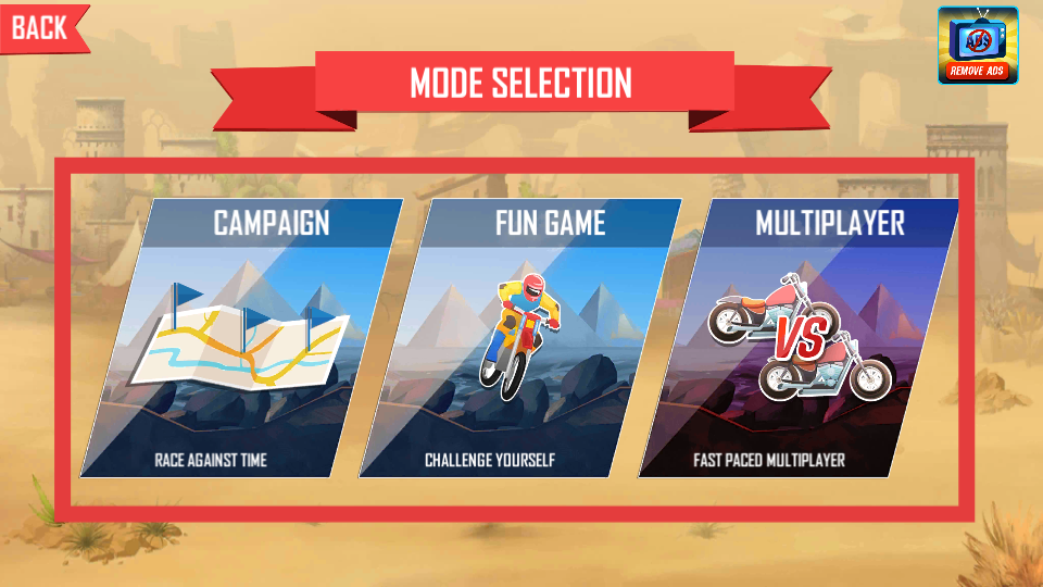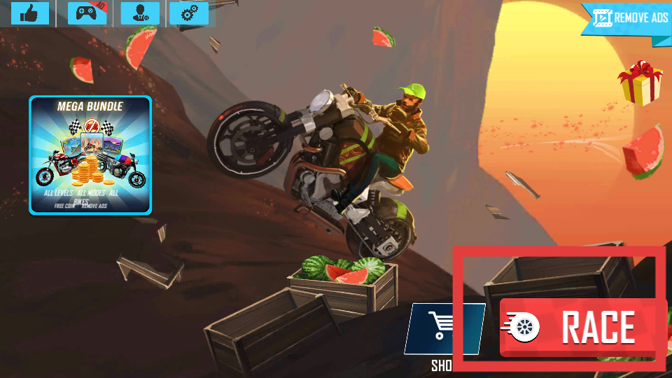 1、玩家下載游戲之后在游戲主界面,點擊RACE按鈕進入游戲,選擇自己喜歡的摩托車和角色外觀,準備開始刺激的摩托比賽。