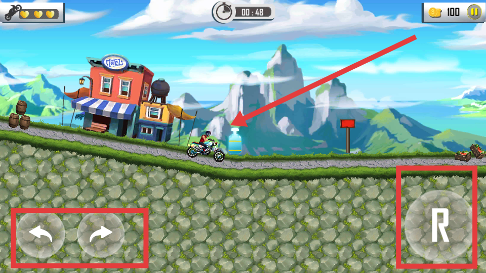 3、在游戲過程中利用屏幕左下角的左右方向虛擬按鍵控制摩托車的前進方向和平衡,避免摔倒點擊屏幕右下角的R按鍵進行加速,同時注意收集路上的道具和金幣。