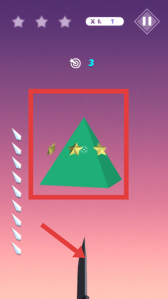 2、進(jìn)入關(guān)卡后操控下方的飛刀箭頭所指,瞄準(zhǔn)上方的目標(biāo)物體如紅框內(nèi)的三角形物體進(jìn)行投擲,將飛刀扎入目標(biāo)物體。