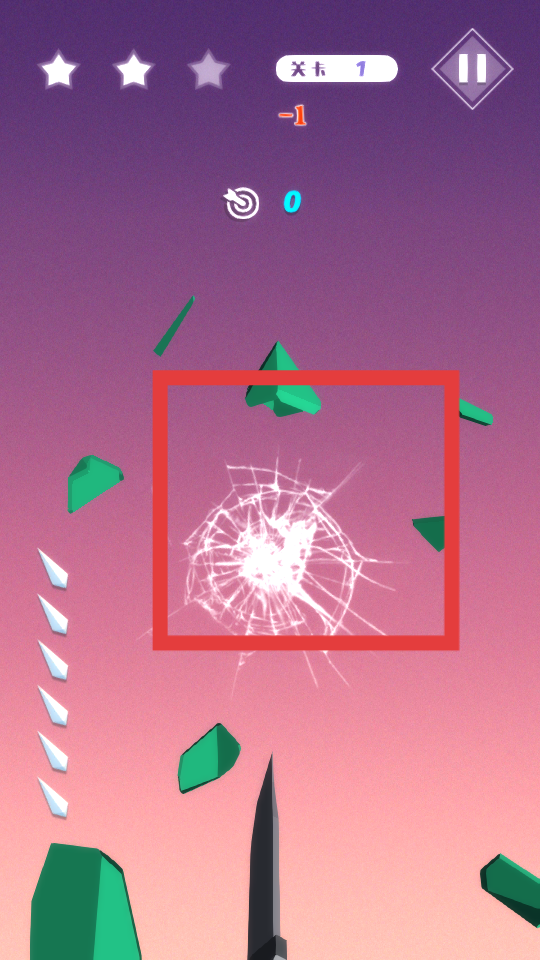 3、當(dāng)成功將足夠數(shù)量的飛刀扎入目標(biāo)物體后,目標(biāo)物體會被擊碎紅框內(nèi)的爆炸效果,玩家即可完成當(dāng)前關(guān)卡任務(wù)。