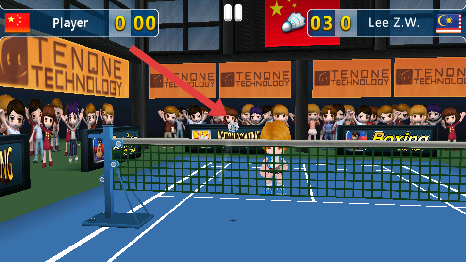3、當(dāng)成功將羽毛球擊到對(duì)方場(chǎng)地,而對(duì)方未接到球或者擊球出界等失誤時(shí),自己就能獲得分?jǐn)?shù),屏幕上方會(huì)實(shí)時(shí)顯示雙方的比分。
