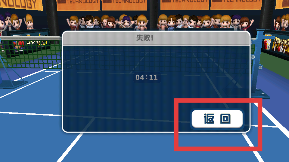 4、如果比賽失敗,會(huì)出現(xiàn)失敗提示點(diǎn)擊返回按鈕,可以回到游戲主界面,重新選擇游戲模式開始新的比賽。