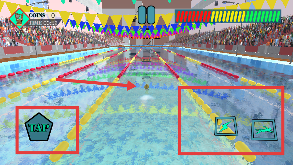 3、在比賽過(guò)程中點(diǎn)擊屏幕左側(cè)TAP按鈕進(jìn)行普通加速,點(diǎn)擊屏幕右側(cè)的不同游泳姿勢(shì)按鈕,讓角色切換不同的游泳動(dòng)作,以更快地前進(jìn)。