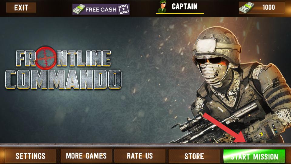 1、游戲初始界面有FRONTLINE COMMANDO標題,還有SETTINGS,STORE等選項,點擊START MISSION,就能開啟戰(zhàn)斗任務(wù)。