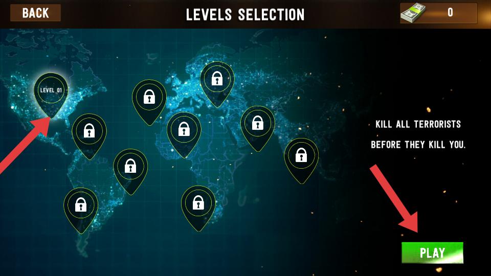 3、在關(guān)卡選擇界面,能看到多個關(guān)卡標記,選擇LEVEL01,點擊PLAY,即可進入第一關(guān),開始戰(zhàn)斗。
