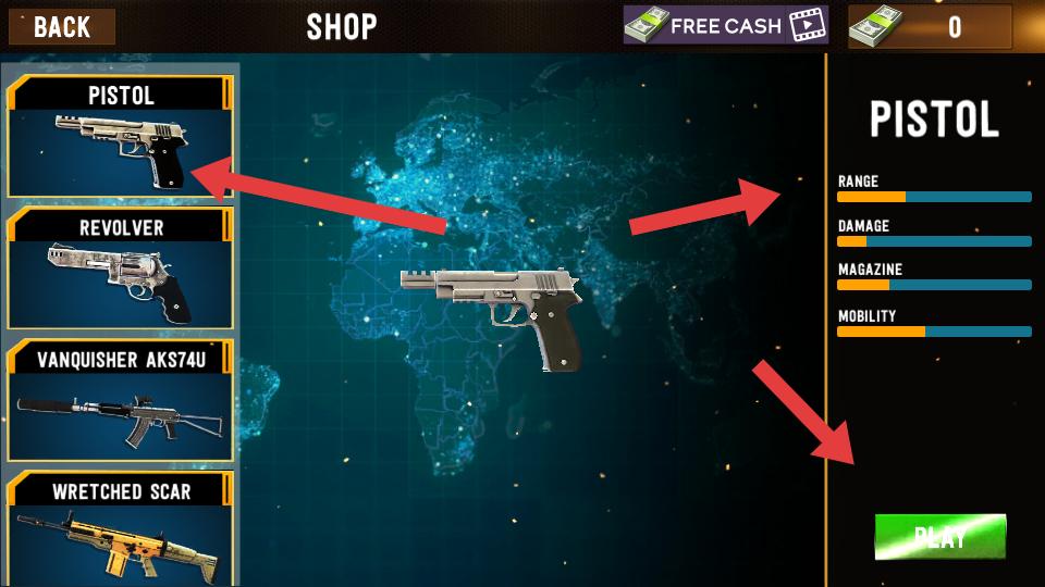 4、在商店界面有PISTOL,REVOLVER等多種槍械,查看槍械的RANGE,DAMAGE等屬性,選好槍械后點擊PLAY,帶著槍械進入戰(zhàn)斗。