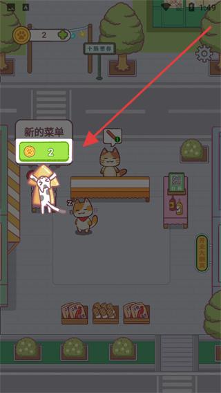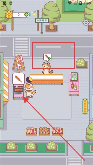 1、進(jìn)入游戲看到貓咪經(jīng)營(yíng)的小吃攤場(chǎng)景,點(diǎn)擊攤位旁的提示區(qū)域,觸發(fā)新菜單相關(guān)操作,為后續(xù)經(jīng)營(yíng)小吃攤做準(zhǔn)備。