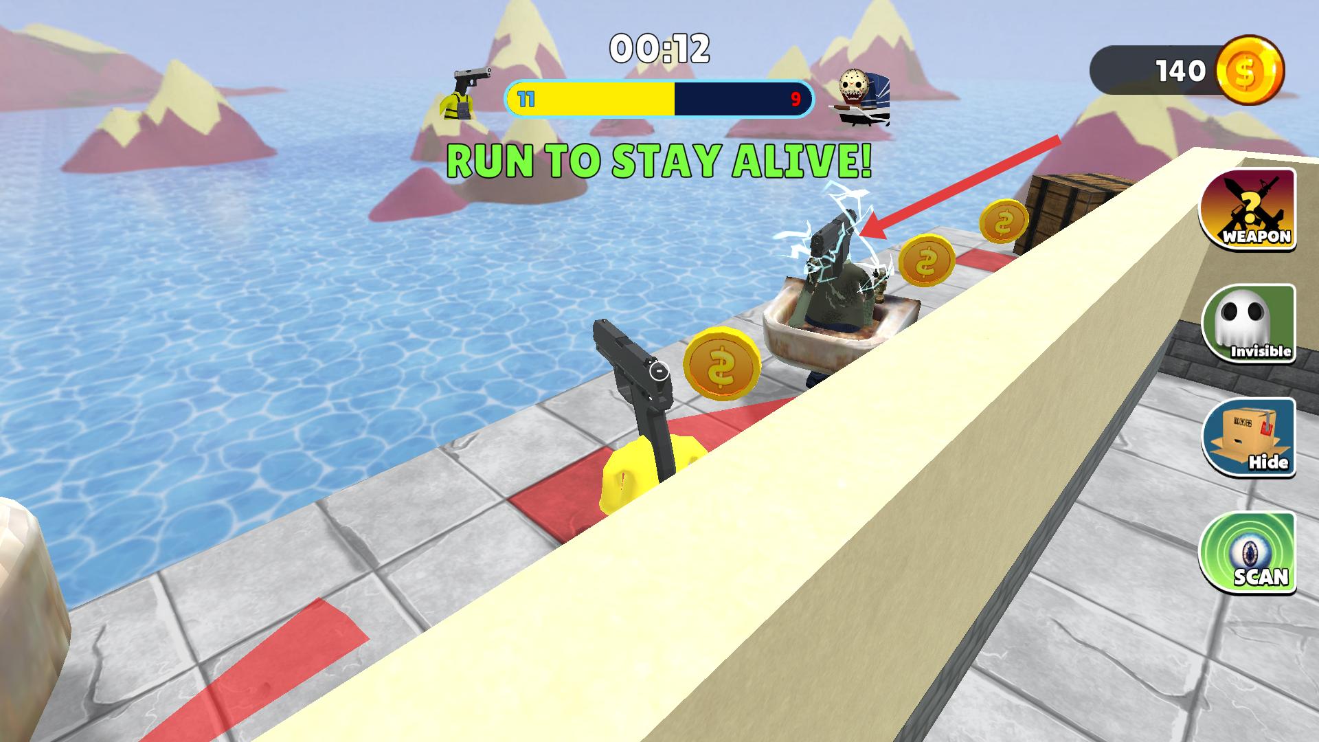 4、游戲中要時(shí)刻奔跑,躲避敵人攻擊,右側(cè)有武器、隱身等技能按鈕,可根據(jù)情況使用,保障生存與戰(zhàn)斗。