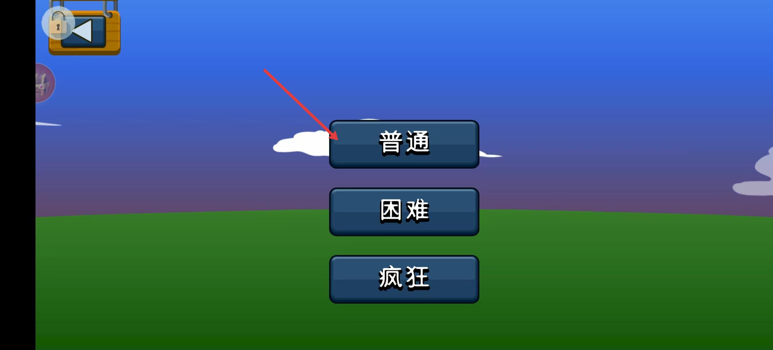 1、進入佳作后,首先看到有普通、困難、瘋狂三個難度選項,選擇普通難度,即可進入相關界面。