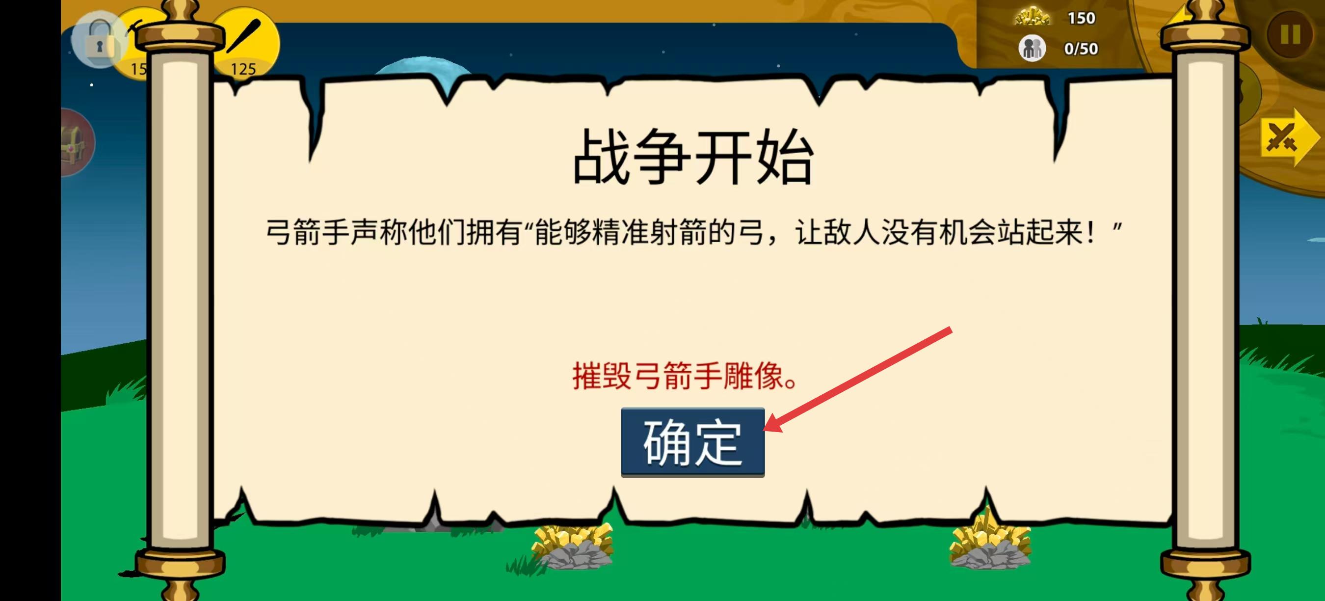 2、接著在出現的界面中看到顯示戰(zhàn)爭開始,還有摧毀弓箭手雕像的任務提示,點擊確定按鈕,就能進入實際戰(zhàn)斗場景。