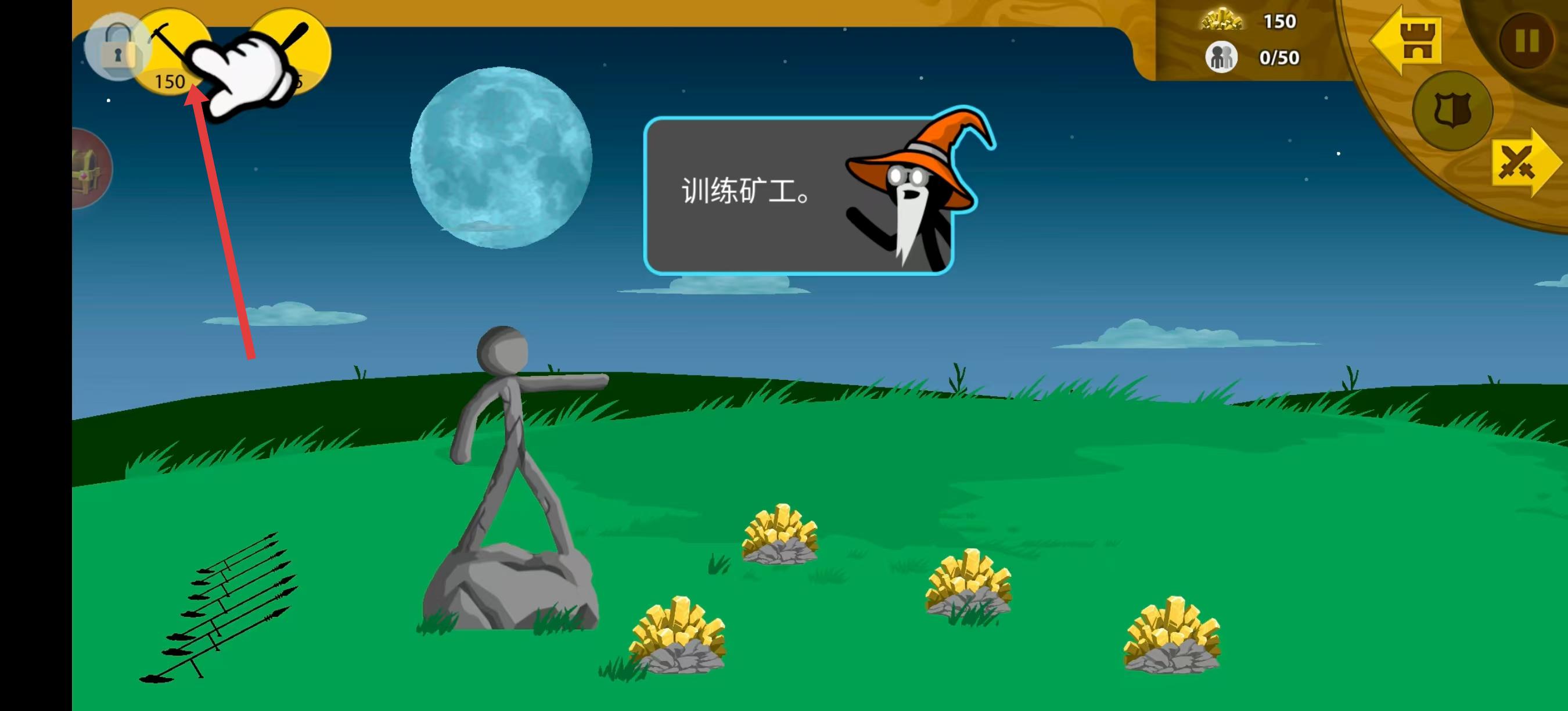3、然后進入實際戰(zhàn)斗場景,看到有訓練礦工的提示,按照提示,點擊上方對應的標識,開始訓練礦工,為后續(xù)戰(zhàn)斗做準備,推進關卡進程。