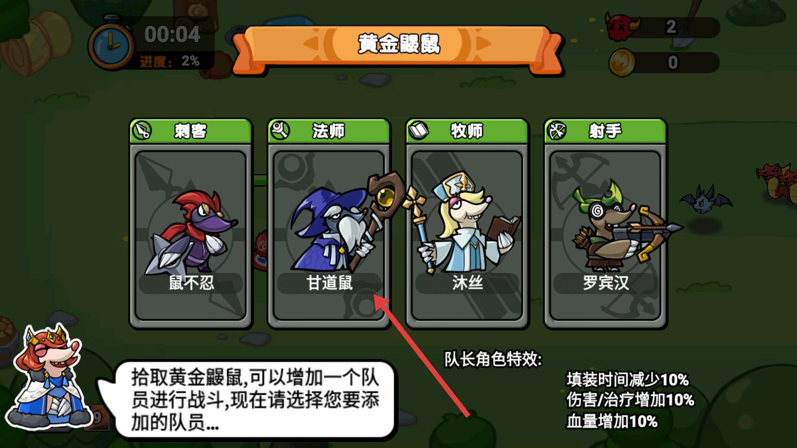 3、然后拾取黃金鼴鼠后,會出現(xiàn)刺客、法師、牧師、射手等隊(duì)員角色卡,根據(jù)戰(zhàn)斗需要,選擇要添加的隊(duì)員,增強(qiáng)戰(zhàn)斗隊(duì)伍實(shí)力,繼續(xù)推進(jìn)戰(zhàn)斗。