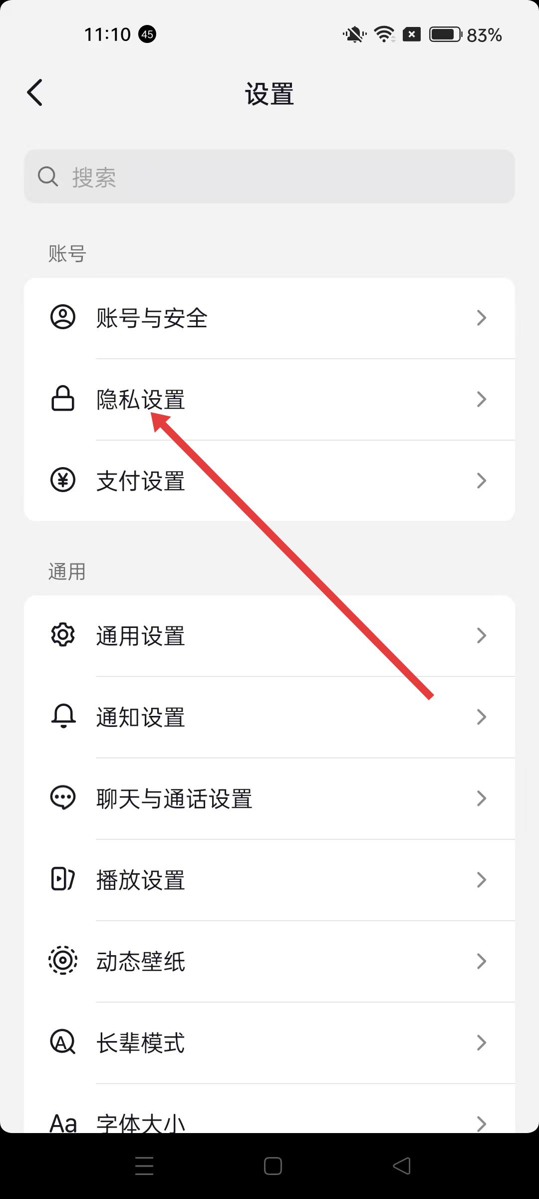 3、設(shè)置頁面點擊隱私設(shè)置,進入隱私相關(guān)設(shè)置界面,可對同城展示、在線狀態(tài)等進行管理。