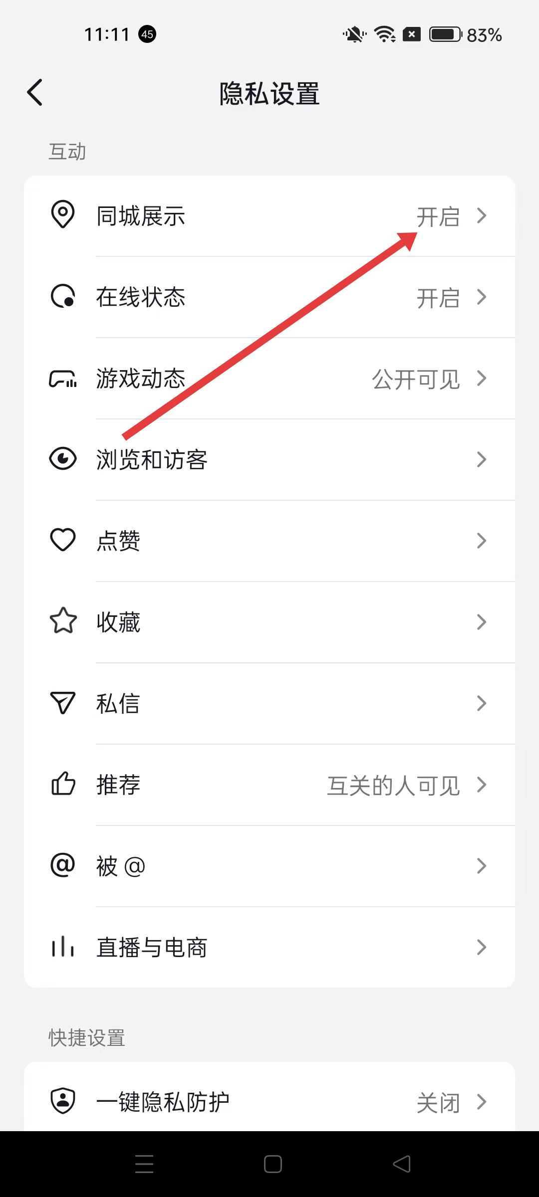 4、隱私設(shè)置頁面可點擊同城展示,對其開啟或關(guān)閉狀態(tài)進行設(shè)置,管理同城展示權(quán)限。