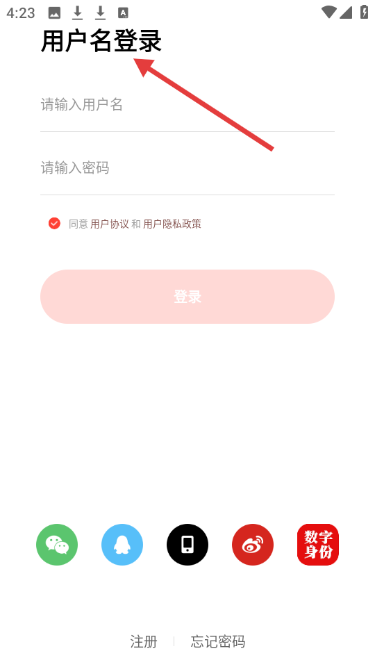 1、用戶名登錄頁(yè)設(shè)有用戶名與密碼輸入框,需勾選同意協(xié)議才可登錄,底部提供注冊(cè)、忘記密碼及第三方登錄方式。