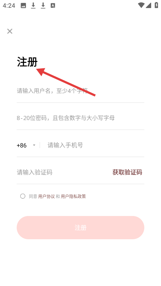 2、注冊(cè)頁(yè)面提示用戶名至少4字符,密碼8、20位含數(shù)字與大小寫(xiě)字母,需填手機(jī)號(hào)、驗(yàn)證碼,同意協(xié)議后注冊(cè)。