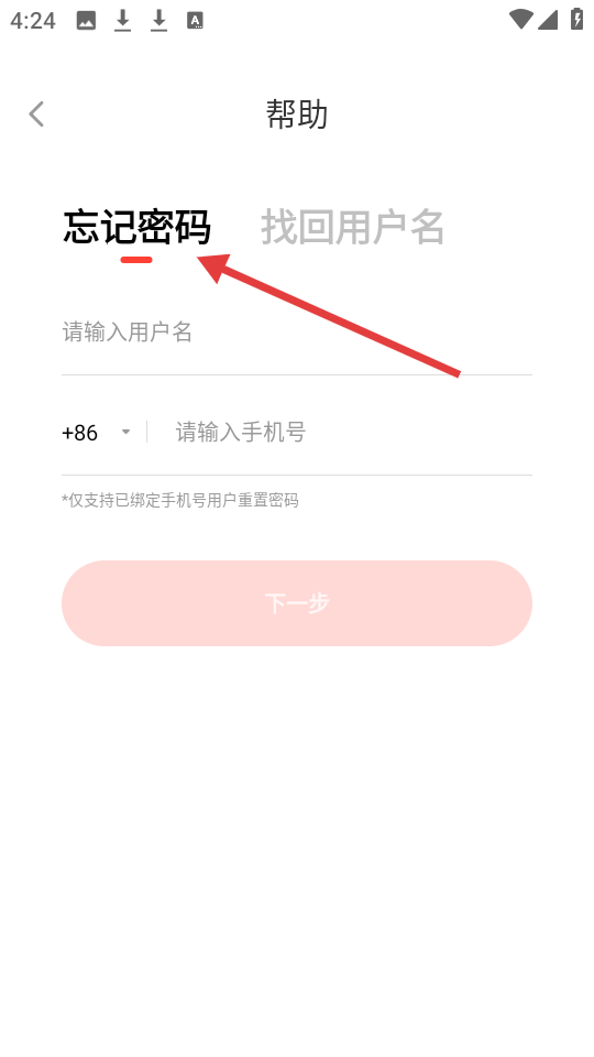 3、忘記密碼頁(yè)區(qū)分忘記密碼和找回用戶名功能,輸入用戶名與已綁定手機(jī)號(hào),僅支持此類(lèi)用戶重置密碼。