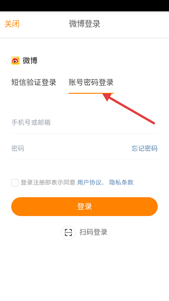 4、微博登錄頁(yè)分短信驗(yàn)證和賬號(hào)密碼登錄,填寫(xiě)手機(jī)號(hào)郵箱、密碼,勾選同意協(xié)議,可選擇登錄或掃碼登錄。