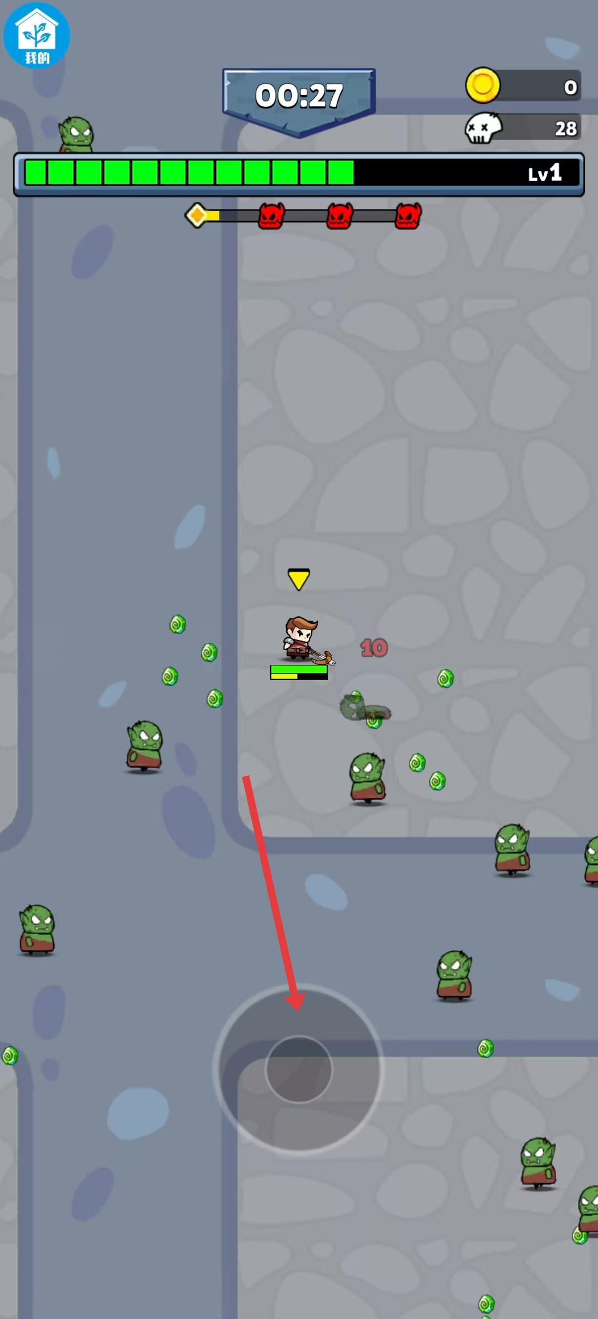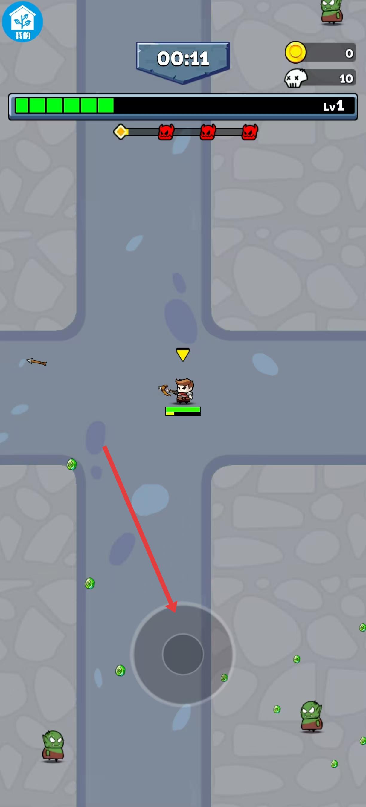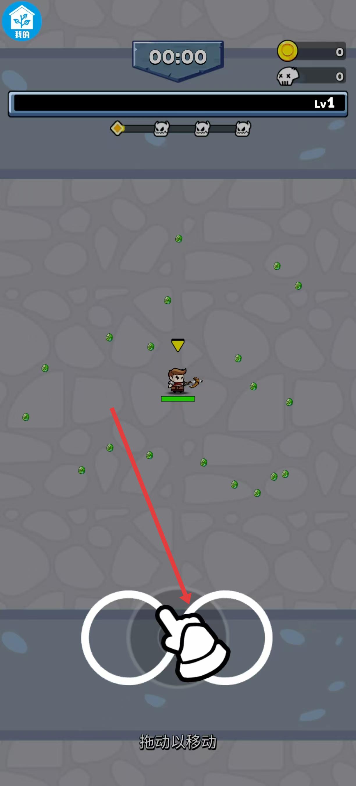 2、角色移動(dòng)后,進(jìn)入有綠色怪物的場(chǎng)景,繼續(xù)通過(guò)操作區(qū)域控制角色移動(dòng),同時(shí)角色會(huì)自動(dòng)攻擊周?chē)木G色怪物,推進(jìn)佳作。