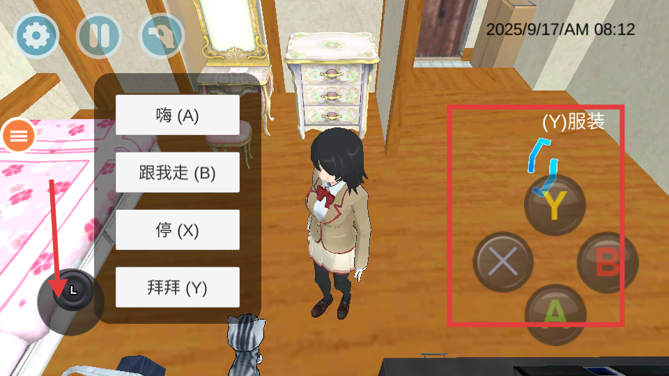 2、進(jìn)入游戲界面有操作按鈕和互動(dòng)選項(xiàng),如按Y鍵可更換服裝、互動(dòng)等,比如與寵物互動(dòng)出現(xiàn)選擇嗨、跟我走等互動(dòng)指令,玩家可以自由與場(chǎng)景內(nèi)元素互動(dòng)。