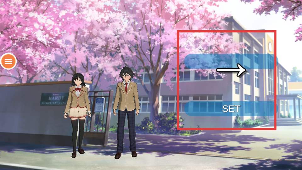 1、玩家進(jìn)入游戲首先會(huì)在櫻花樹下的場(chǎng)景界面,可點(diǎn)擊右側(cè)箭頭和SET按鈕,進(jìn)行場(chǎng)景或角色相關(guān)設(shè)置,打造心儀的初始狀態(tài)。