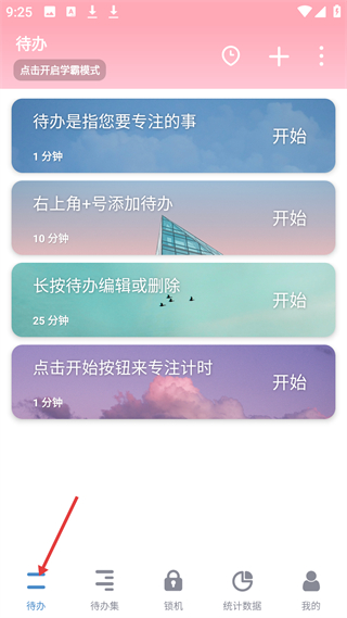 1、待辦板塊可添加不同時長的待辦任務,能開啟學霸模式,助力管理待辦事項,高效完成任務,還有編輯刪除等操作說明。