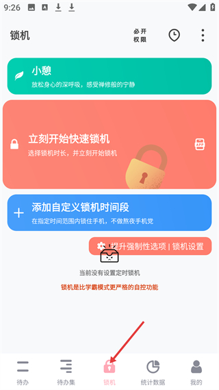 3、鎖機板塊有小憩、快速鎖機、自定義鎖機時間段功能,是比學霸模式更嚴格的自控工具,幫助減少手機干擾。