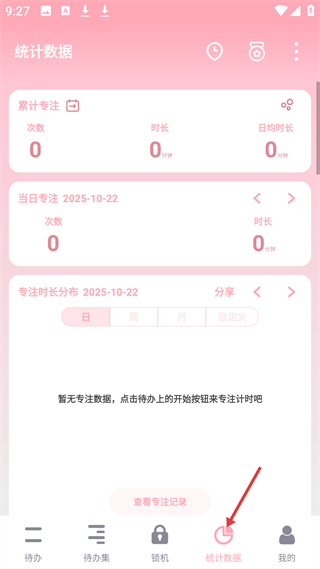 4、統(tǒng)計數(shù)據(jù)板塊可查看累計專注、當日專注及專注時長分布,助力用戶了解專注情況,合理規(guī)劃時間,還能查看專注記錄。