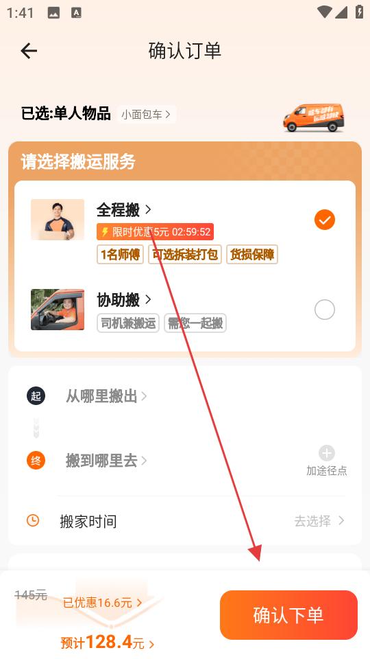 2、在確認訂單頁,選全程搬等搬運服務,填寫搬出地、搬入地、搬家時間,核對費用后,點擊確認下單按鈕。