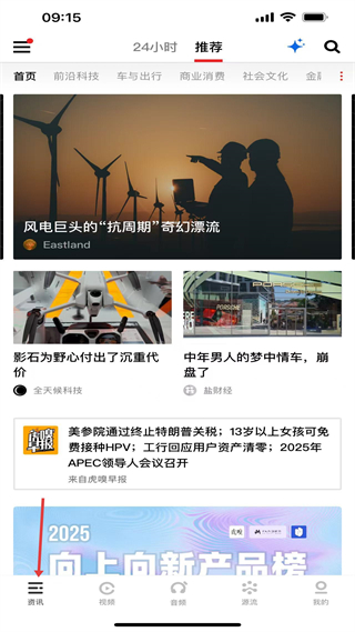 1、資訊界面,有搜索欄,設(shè)多個(gè)板塊,分多個(gè)分類,展示風(fēng)電巨頭、影石等資訊,底部有多個(gè)功能入口。