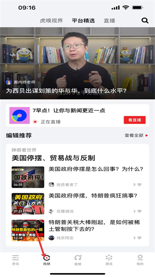2、視頻界面有多個(gè)板塊,展示西貝、美國(guó)停擺等視頻內(nèi)容,還有編輯推薦的視頻資訊,底部功能入口一致。