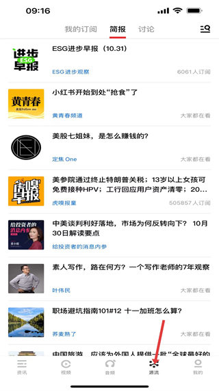 4、源流界面,有我的訂閱、簡(jiǎn)報(bào)、討論板塊,展示ESG早報(bào)、小紅書、美股七姐妹等資訊,底部功能入口與其他界面一致。