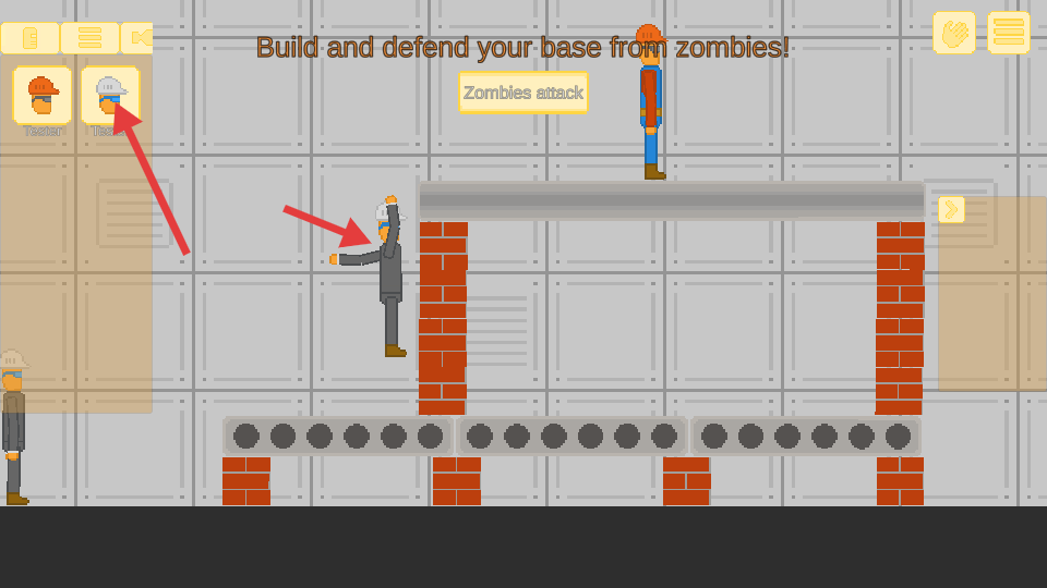 2、進(jìn)入Zombie mode后可選擇工人角色,操控其建造基地,利用磚塊等材料搭建防御工事,為抵御僵尸攻擊做準(zhǔn)備。