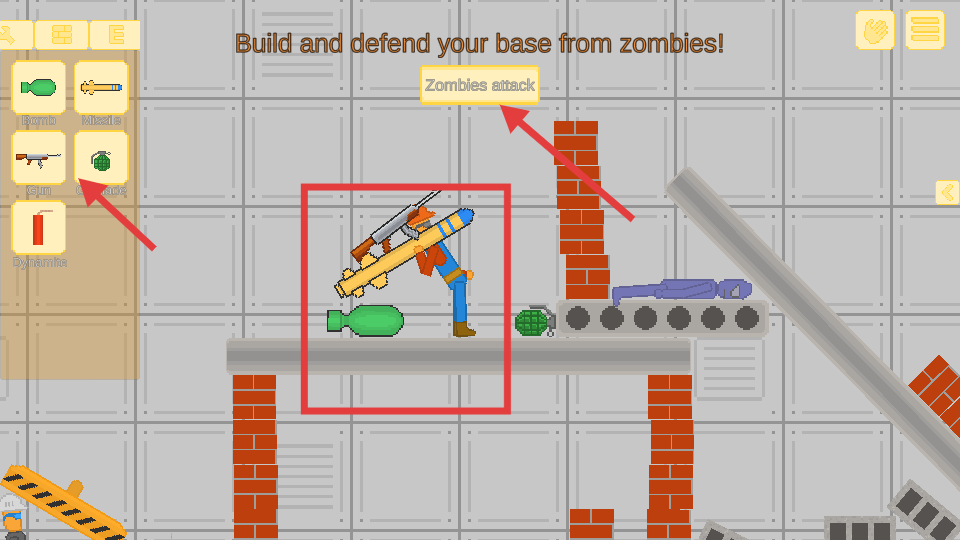 3、當(dāng)僵尸來襲時(shí)左側(cè)有炸彈、槍械等武器選項(xiàng),選擇合適武器點(diǎn)擊使用,攻擊靠近的僵尸保護(hù)基地安全。