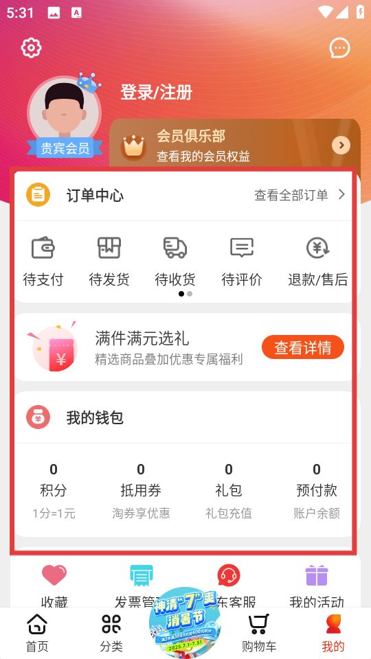 3、我的頁(yè)面可以進(jìn)行登錄和注冊(cè)操作,同時(shí)設(shè)有訂單中心可以查看全部訂單,此外還有滿件滿元選禮活動(dòng)入口和我的錢包板塊,方便管理自己的購(gòu)物資產(chǎn)。