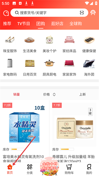 1、首頁(yè)有珠寶服飾、生活美食等品類分類,還展示富培美水精靈有氧洗劑、香娜露兒羊胎素綿羊油等商品,方便用戶瀏覽選購(gòu)。