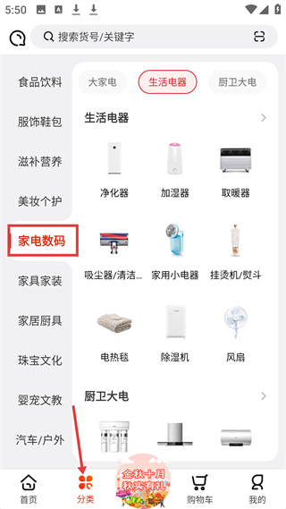 2、分類頁(yè)面涵蓋食品飲料、家電數(shù)碼等眾多品類,家電數(shù)碼類又細(xì)分生活電器、廚衛(wèi)大電等,方便用戶精準(zhǔn)查找所需商品。