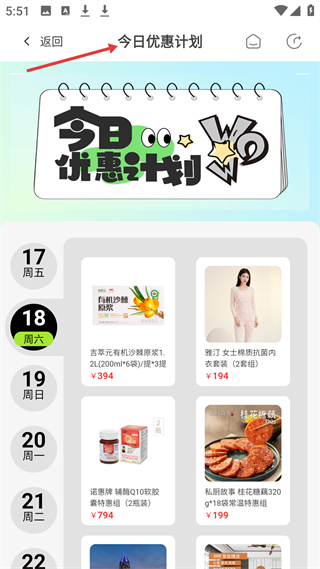 4、今日優(yōu)惠計(jì)劃頁(yè)面,呈現(xiàn)有機(jī)沙棘原漿、女士棉質(zhì)內(nèi)衣套裝等優(yōu)惠商品,還有日期選擇欄,方便查看不同日期優(yōu)惠。