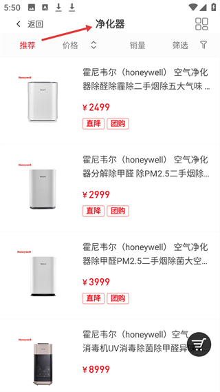 3、凈化器頁(yè)面展示多款霍尼韋爾空氣凈化器,有不同價(jià)格區(qū)間,且標(biāo)注直降、團(tuán)購(gòu)優(yōu)惠,滿足凈化空氣需求。