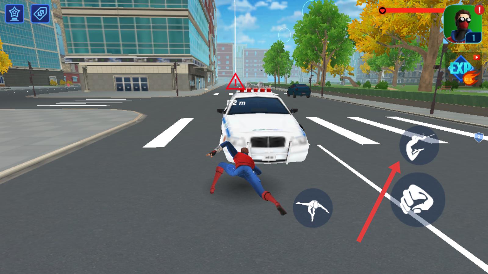 1、進(jìn)入佳作后,操控蜘蛛俠在道路行動(dòng),遇警車阻攔時(shí)點(diǎn)擊右側(cè)對(duì)應(yīng)技能圖標(biāo),借助技能與警車互動(dòng),推進(jìn)任務(wù)進(jìn)程,畫面有建筑和車輛營造城市環(huán)境。