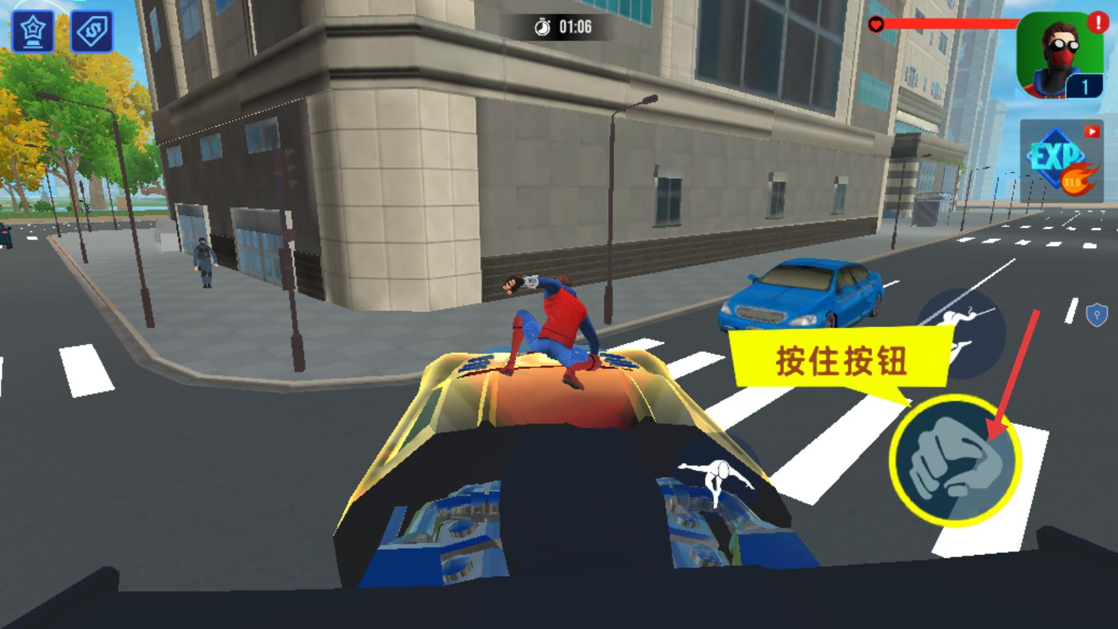 2、后續(xù)在街道遭遇車輛,按提示按住對(duì)應(yīng)按鈕,讓蜘蛛俠在車身上施展動(dòng)作,完成交互,周圍建筑行人豐富場(chǎng)景,持續(xù)推進(jìn)任務(wù)。
