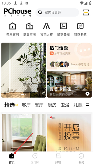 1、 首頁(yè)有整屋案例等入口,展示熱門(mén)話題、最美中國(guó)家,可看客廳等精選案例,找家居設(shè)計(jì)靈感。