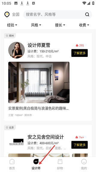 2、設(shè)計(jì)師頁(yè)可篩經(jīng)驗(yàn)、風(fēng)格,展示夏雪等設(shè)計(jì)師,了解設(shè)計(jì)費(fèi)、風(fēng)格,找心儀家居設(shè)計(jì)師。
