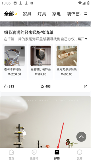 3、好物頁(yè)有家具等分類,展示輕奢風(fēng)好物清單,如透明環(huán)氧樹(shù)脂椅,可選購(gòu)家居好物,打造理想家。