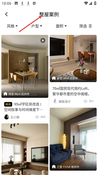 4、整屋案例頁(yè),可篩風(fēng)格、戶型,展示杭州學(xué)區(qū)房改造等案例,看不同整屋設(shè)計(jì),獲取裝修參考。