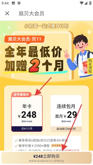 4、在支付頁面選擇支付寶支付或微信支付的支付方式,完成支付流程,即可開通扇貝大會員,享受會員專屬的閱讀、聽力等學(xué)習(xí)權(quán)益。