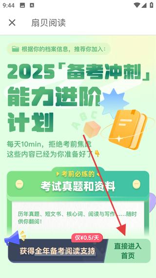 1、進(jìn)入軟件推薦頁面,點擊直接進(jìn)入首頁,跳過備考沖刺能力進(jìn)階計劃的推薦,進(jìn)入軟件主界面。