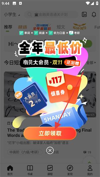 2、在主界面中若彈出全年最低價的會員優(yōu)惠彈窗,點擊立即領(lǐng)取,進(jìn)入扇貝大會員的購買頁面。