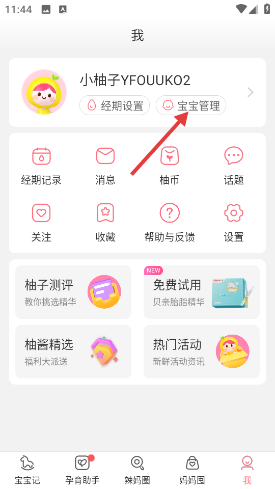 1、打開app點擊底部導(dǎo)航欄中的我,在我的頁面中找到自己的頭像及昵稱區(qū)域,點擊寶寶管理按鈕,即可進入寶寶管理相關(guān)界面,開啟添加二胎信息的第一步。
