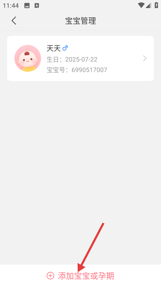 2、進入寶寶管理頁面后,若已有寶寶信息顯示,在頁面下方找到添加寶寶或孕期按鈕,點擊該按鈕進入添加新寶寶信息的界面,為錄入二胎信息做準(zhǔn)備。